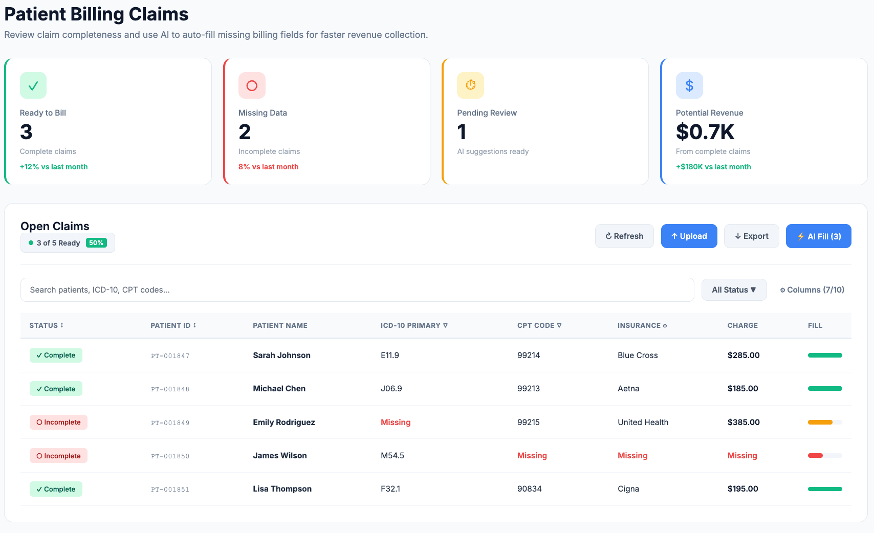 Automatically detect missing ICD-10 codes, validate billing accuracy, and maximize reimbursement rates by ensuring every claim captures the full value of care delivered.